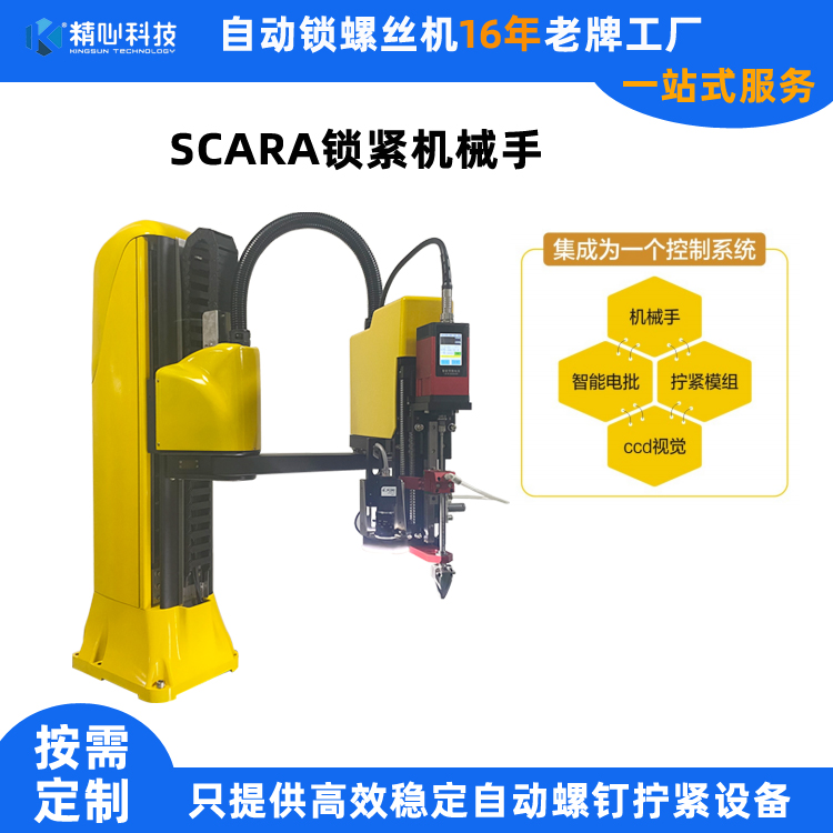 精心科技16年來一直專注螺釘鎖緊、輸送領(lǐng)域。經(jīng)過不斷的研發(fā)創(chuàng)新,將機(jī)械手、智能電批、擰緊模組和CCD視覺檢測(cè)集成為一個(gè)控制系統(tǒng),在簡便設(shè)備的操作使用的同時(shí)還能精準(zhǔn)高效的鎖附螺釘。通過單元間的配合使用,鎖緊機(jī)械手可以適用更多的尺寸和應(yīng)用場(chǎng)景。精心科技鎖螺絲機(jī)械手擁有先進(jìn)的自主學(xué)習(xí)功能,讓操作變得更加簡單。